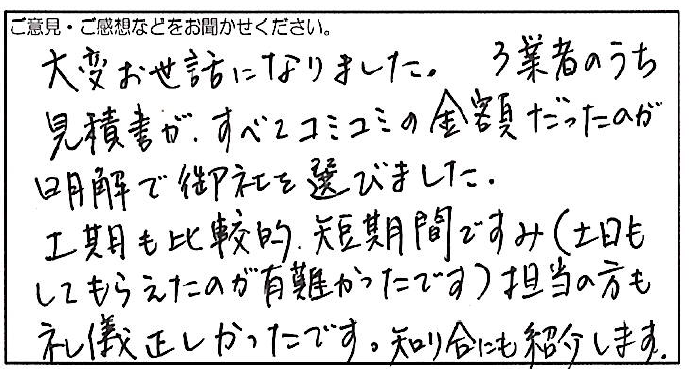 2024.01.23 お客様の声 神戸市 匿名様 大変お世話になりました。3業者のうち 見積書が、すべてコミコミの金額だったのが 明解で御社を選びました。 工期も比較的、短期間ですみ(土日も してもらえたのが有難かったです)担当の方も 礼儀正しかったです。知り合にも紹介します。 お客様へ この度は弊社にご依頼いただき、誠にありがとうございます。 ご満足いただけたようで、とても嬉しく思います。 ご紹介割引もございますのでまたお気軽ご連絡ください。
