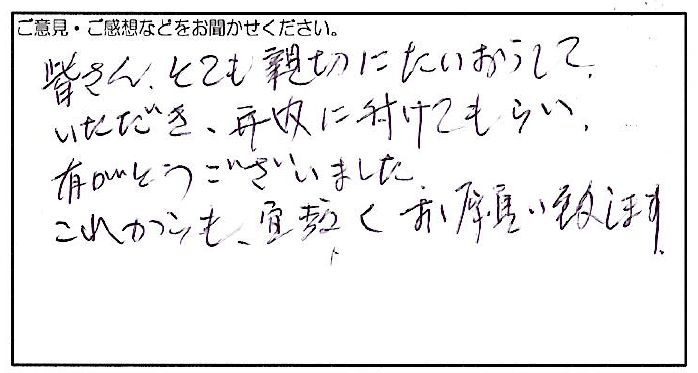 2024.01.25 お客様の声 神戸市 匿名様 皆さん、とても親切にたいおうして いただき、年内に付けてもらい 有がとうございました。 これからも、宜しくお願い致します。 お客様へ この度は弊社にご依頼いただき、誠にありがとうございます。 今後もお客様に満足いただけるよう 一層努力してまいります。