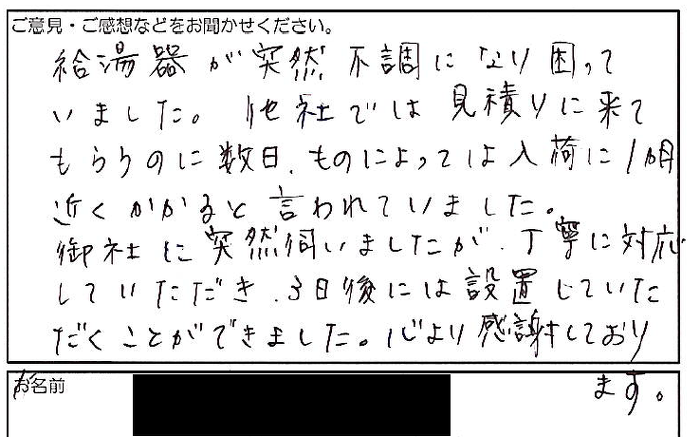 2024.01.25 お客様の声 西宮市 匿名様 給湯器が突然不調になり困って いました。他社では見積りに来て もらうのに数日、ものによっては入荷に1ヵ月 近くかかると言われていました。 御社に突然伺いましたが、丁寧に対応 していただき、3日後には設置していた だくことができました。心より感謝しております。 お客様へ この度は弊社にご依頼いただき、誠にありがとうございます。 心温まるお言葉をいただき、大変うれしい限りです。 お客様からいただいたお言葉は、全社員の励みになります。