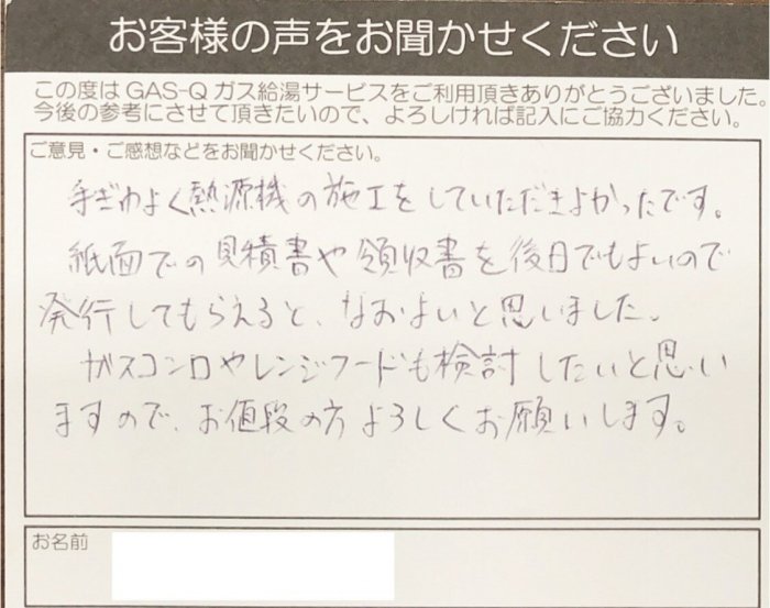 2021.07.12 お客様の声 芦屋市 匿名 この度は弊社に交換工事をお任せいただき 誠にありがとうございました。 紙面での見積書、領収書発行してお送りいたします ご不便おかけして大変申し訳ありませんでした。 ご指摘ありがとうございます。 また、ガスコンロ、レンジフード 値段記載のカタログ、同封させていただきますので ご検討のほうよろしくお願いいたします。 また何かございましたら弊社のまでご連絡ください。 貴重なお時間ご意見ありがとうございました。