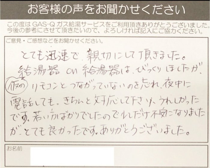 2021.07.12 お客様の声 神戸市須磨区 匿名 この度は弊社に交換工事をお任せいただき 誠にありがとうございました。 お褒めのお言葉大変ありがたく頂戴いたします。 お客様のお役に立つことができて従業員一同 とても嬉しく思っております。 また、些細なことでも構いませんので ライン、電話、メールお待ちいたしております。 貴重なお時間ご意見ありがとうございました。