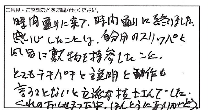 2024.02.23 お客様の声 横浜市 匿名様 時間通りに来て、時間通りに終りました。 感心したことは、自分用のスリッパと 風呂に敷物を持参したこと。 とてもテキパキと説明と動作も 言うことない立派な技士さんでした。 くれのおしせまった中、ほんとうにありがとう。 お客様へ この度は弊社にご依頼いただき、誠にありがとうございます。 弊社の施工にご満足いただけましたようで大変嬉しく思います。 今後も、よりよいサービスを お届けできるよう努めてまいります。