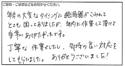2024.02.23 お客様の声 神戸市 匿名様 年末の大変なタイミングに給湯器がこわれて とても困っておりましたが、年内に作業して頂けて 非常にありがたかったです。 丁寧な作業でしたし、気持の良い対応を してもらいました。ありがとうございました! お客様へ この度は弊社にご依頼いただき、誠にありがとうございます。 嬉しいお言葉をいただき、大変恐縮でございます。 今後とも、何卒よろしくお願いいたします。