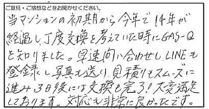 2024.02.23 お客様の声 横浜市 大垣様 当マンションの初期から今年で14年が 経過し、丁度交換を考えていた時にGAS-Q を知りました。早速問い合わせし、LINEも 登録し写真も送り、見積りもスムーズに 進み3日後には交換も完了!大変満足 しております。対応も非常に良かったです。 お客様へ この度は弊社にご依頼いただき、誠にありがとうございます。 嬉しいお言葉をいただき、大変恐縮でございます。 今後も、よりよいサービスを お届けできるよう努めてまいります。