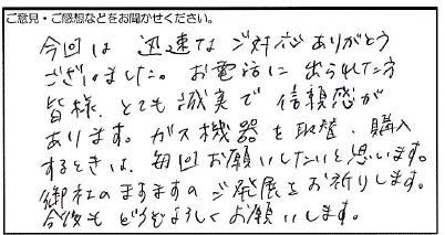 2024.02.23 お客様の声 西宮市 匿名様 今回は迅速なご対応ありがとう ございました。お電話に出られた方、 皆様、とても誠実で信頼感が あります。ガス機器を取替、購入 するときは、毎回お願いしたいと思います。 御社のますますのご発展をお祈りします。 今後ともどうぞよろしくお願いします。 お客様へ この度は弊社にご依頼いただき、誠にありがとうございます。 嬉しいお言葉をいただき、私たちもとても嬉しく思います。 これからもご満足いただけるサービスを ご提供できるよう努めてまいります。