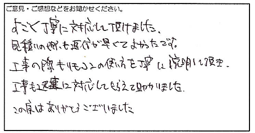 2024.02.25 お客様の声 大阪市 匿名様 すごく丁寧に対応して頂けました。 見積りの際も返信が早くてよかったです。 工事の際もリモコンの使い方を丁寧に説明して頂き、 工事も迅速に対応してもらえて助かりました。 この度はありがとうございました。 お客様へ この度は弊社にご依頼いただき、誠にありがとうございます。 お客様からのご感想をいただけて、 私たちもとても嬉しく思います。 今後とも、何卒よろしくお願いいたします。