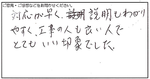 2024.02.25 お客様の声 神戸市 清水様 対応が早く、説明もわかり やすく、工事の人も良い人で とてもいい印象でした。 お客様へ この度は弊社にご依頼いただき、誠にありがとうございます。 弊社の施工、対応にご満足いただけましたようで 担当共々、大変嬉しく思います。 今後とも、何卒よろしくお願いいたします。