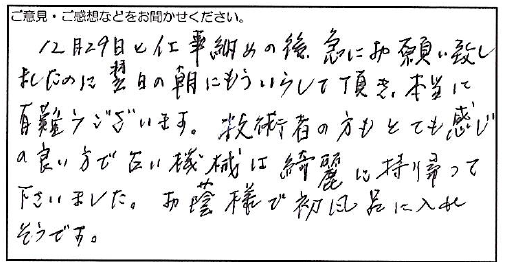 2024.02.25 お客様の声 宝塚市 匿名様 12月29日と仕事納めの後、急にお願い致し ましたのに翌日の朝にもういらして頂き、本当に 有難うございます。技術者の方もとても感じ の良い方で古い機械は綺麗に持帰って 下さいました。お陰様で初風呂に入れ そうです。 お客様へ この度は弊社にご依頼いただき、誠にありがとうございます。 お客様からのご感想をいただけて、 私たちもとても嬉しく思います。 今後もお客様に満足いただけるよう 一層努力してまいります。