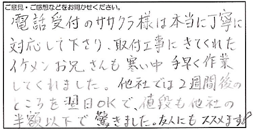 2024.02.25 お客様の声 西宮市 匿名様 電話受付のササクラ様は本当に丁寧に 対応して下さり、取付工事にきてくれた イケメンお兄さんも寒い中手早く作業 してくれました。他社では2週間後の ところを翌日OKで、値段も他社の 半額以下で驚きました。友人にもススメます! お客様へ この度は弊社にご依頼いただき、誠にありがとうございます。 お客様からいただいたお言葉は、 全社員の励みになります。 今後とも、何卒よろしくお願いいたします。