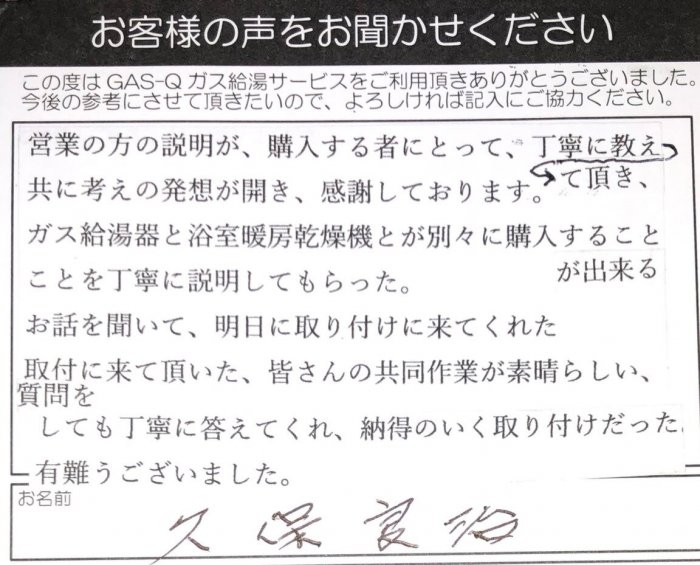 2021.07.12 お客様の声 神戸市垂水区 久保様 久保様、この度は弊社に交換工事をお任せいただき 誠にありがとうございました。 お褒めの言葉ありがたく頂戴いたします。 久保様にご納得の上ご理解いただき 金額、交換工事共に満足いただき 従業員一同大変嬉しく思っております。 ご不明点などございましたらお気軽に 弊社にてお問合せください。 貴重なお時間ご意見ありがとうございました。