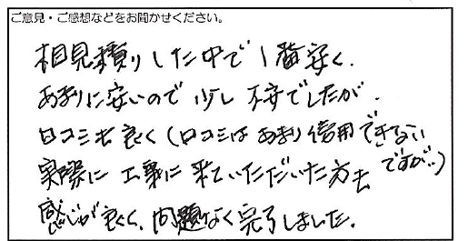 2024.02.28 お客様の声 西宮市 Y様 相見積りした中で1番安く、 あまりに安いので少し不安でしたが、 口コミも良く(口コミはあまり信用できないですが) 実際に工事に来ていただいた方も 感じが良く、問題なく完了しました。 お客様へ この度は弊社にご依頼いただき、誠にありがとうございます。 数ある会社の中から弊社をお選びいただき 大変うれしく思います。 今後とも、何卒よろしくお願いいたします。