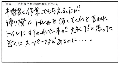 2024.02.28 お客様の声 大阪市 匿名様 手際良く作業してもらえましたが 帰り際にトイレを貸してくれと言われ トイレに行かれた事が失礼だと思った 近くにスーパーなどあるのに、、、。 お客様へ この度は弊社にご依頼いただき、誠にありがとうございます。 また、この度はご不満をおかけしてしまい、大変申し訳ございませんでした。 お客様に満足いただけるよう一層努力してまいります。