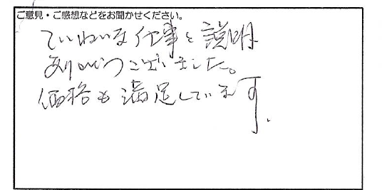 2024.03.02 お客様の声 大阪市 匿名様 ていねいな仕事と説明 ありがとうございました。 価格も満足しています。 お客様へ この度は弊社にご依頼いただき、誠にありがとうございます。 ご満足いただけましたようで、私たちもとても嬉しく思います。 今後とも、何卒よろしくお願いいたします。