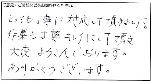 2024.03.02 お客様の声 茨木市 Y様 とっても丁寧に対応して頂きました。 作業も丁寧キレイにして頂き 大変よろこんでおります。 ありがとうございます。 お客様へ この度は弊社にご依頼いただき、誠にありがとうございます。 これからもご満足いただけるサービスを ご提供できるよう努めてまいります。 変わらぬご愛顧のほど、よろしくお願いいたします。