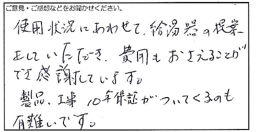 2024.03.02 お客様の声 神戸市 匿名様 使用状況にあわせて、給湯器の提案 をしていただき、費用もおさえることが でき感謝しています。 製品、工事10年保証がついてくるのも 有難いです。 お客様へ この度は弊社にご依頼いただき、誠にありがとうございます。 お客様からのご感想をいただけて、 私たちもとても嬉しく思います。 今後もお客様に満足いただけるよう 一層努力してまいります。
