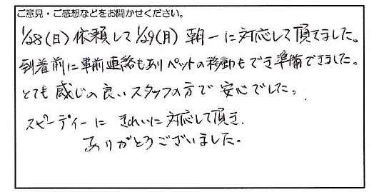 2024.03.02 お客様の声 神戸市 匿名様 1/28(日)依頼して1/29(月)朝一に対応して頂きました。 到着前に事前連絡もありペットの移動もでき準備できました。 とても感じの良いスタッフの方で安心でした。 スピーディーにきれいに対応して頂き、 ありがとうございました。 お客様へ この度は弊社にご依頼いただき、誠にありがとうございます。 数ある業者の中から弊社をお選びいただき 大変うれしく思います。 変わらぬご愛顧のほど、よろしくお願いいたします。