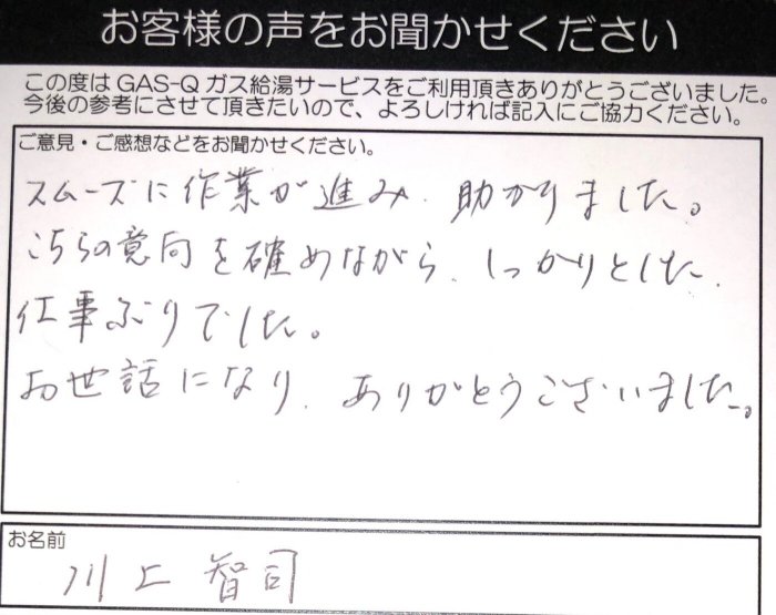 2021.07.12 お客様の声 尼崎市 川上様 川上様、この度は弊社に交換工事をお任せいただき 誠にありがとうございました。 その後いかがお過ごしでしょうか。 川上様のお役に立つことができ 大変嬉しく思っております。 些細なことでも構いませんので、 気軽にお問い合わせください。 従業員一同お待ちいたしております。 貴重なお時間ご意見ありがとうございました。