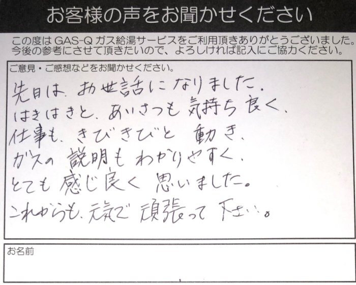 2021.07.12 お客様の声 神戸市垂水区 匿名 この度は弊社に交換工事をお任せいただき 誠にありがとうございました。 お客様に感謝のお言葉をいただけたこと とても嬉しくありがたく思います。 説明や、操作などご不明な点はございませんでしたでしょうか。 些細なことでも構いませんので 困ったことがあれば気軽にご連絡ください。 貴重なお時間ご意見ありがとうございました。