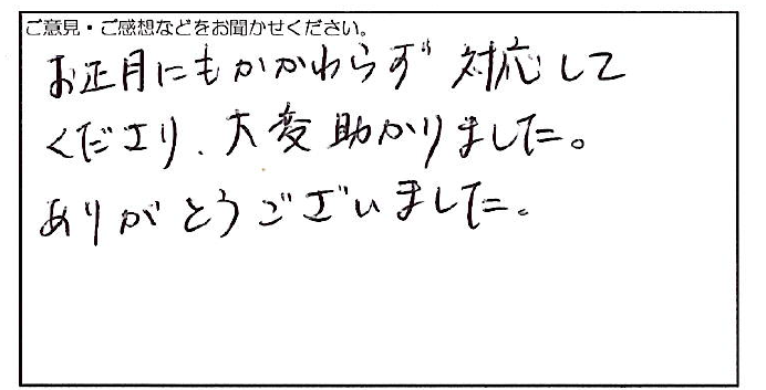 2024.03.20 お客様の声 明石市 ご購入者様 お正月にもかかわらず対応して くださり、大変助かりました。 ありがとうございました。 お客様へ この度は弊社にご依頼いただき、誠にありがとうございます。 こちらこそお正月にもかかわらず、工事にお時間いただきありがとうございます。 また機会がございましたら、ご連絡くださいませ。