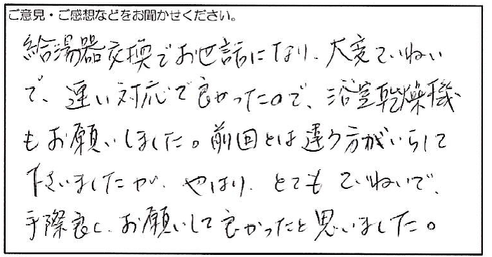 2024.03.20 お客様の声 明石市 匿名様 給湯器交換でお世話になり、大変ていねい で、速い対応で良かったので、浴室乾燥機 もお願いしました。前回とは違う方がいらして 下さいましたが、やはり、とてもていねいで、 手際良く、お願いして良かったと思いました。 お客様へ この度は弊社にご依頼いただき、誠にありがとうございます。 嬉しいお言葉をいただき、大変恐縮でございます。 今後とも、何卒よろしくお願いいたします。