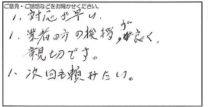 2024.03.20 お客様の声 横浜市 関川様 1.対応が早い 1.業者の方の挨拶が良く 親切です。 1.次回も頼みたい。 お客様へ この度は弊社にご依頼いただき、誠にありがとうございます。 弊社の施工、対応にご満足いただけましたようで 担当共々、大変嬉しく思います。 ご検討の設備がございましたら またお気軽ご連絡ください。