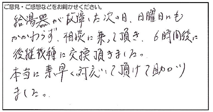 2024.03.20 お客様の声 神戸市 匿名様 給湯器が故障した次の日、日曜日にも かかわらず、相談に乗って頂き、6時間後に 後継機種に交換頂きました。 本当に素早く対応して頂けて助かり ました。 お客様へ この度は弊社にご依頼いただき、誠にありがとうございます。 弊社のサービスにご満足いただけましたようで 大変嬉しく思います。 今後とも、何卒よろしくお願いいたします。