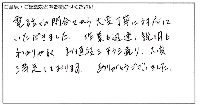 2024.03.20 お客様の声 西宮市 ご購入者様 電話での問合せから大変丁寧に対応して いただきました。作業も迅速、説明も わかりやすく、お値段もチラシ通り、大変 満足しております。ありがとうございました。 お客様へ この度は弊社にご依頼いただき、誠にありがとうございます。 お客様からのご感想をいただけて、とても嬉しく思います。 今後も、よりよいサービスを お届けできるよう努めてまいります。