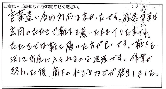2024.03.26 お客様の声 吹田市 ご購入者様 言葉遣い含め対応は良かったです。残念な事は 玄関のたたきで靴下を履いたまま下りた事です。 たたきでは靴を履いた方が良いです。靴下を 汚して部屋に入られるのは迷惑です。作業が 終わった後、廊下の水ぶきなどが発生しました。 お客様へ この度は弊社にご依頼いただき、誠にありがとうございます。 また、この度はご不満をおかけしてしまい、大変申し訳ございませんでした。 ご指摘いただいた点を真摯に受け止め、改善に努めてまいります。
