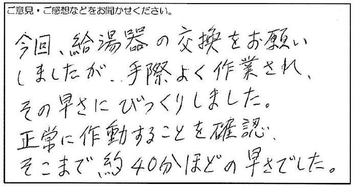 2024.03.26 お客様の声 西宮市 匿名様 今回、給湯器の交換をお願い しましたが、手際よく作業され、 その早さにびっくりしました。 正常に作動することを確認、 そこまで約40分ほどの早さでした。 お客様へ この度は弊社にご依頼いただき、誠にありがとうございます。 工事の早さは弊社の自慢の一つでございます。 これからもご満足いただけるサービスを ご提供できるよう努めてまいります。