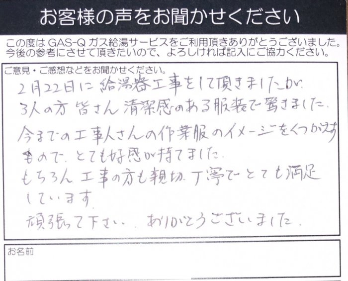 2021.07.21 お客様の声 神戸市東灘区 匿名 この度は弊社に交換工事をお任せいただき 誠にありがとうございました。 清潔な服装はもちろんのこと、 コロナ禍ということもあり、消毒などもこまめに行っております。 お客様に不快感を与えないよう、日ごろから従業員に指導いたしております。 お褒めお言葉大変嬉しく思います。 貴重なお時間ご意見ありがとうございました。