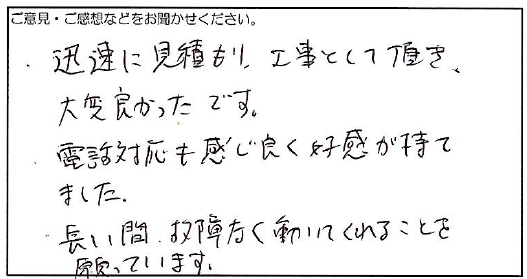 2024.06.05 お客様の声 神戸市 匿名様 ・迅速に見積もり、工事として頂き、 大変良かったです。 ・電話対応も感じ良く好感が持てました。 ・長い間、故障なく動いてくれることを願っています。 お客様へ この度は弊社にご依頼いただき、誠にありがとうございます。 数ある業者の中から弊社をお選びいただき 大変うれしく思います。 今後とも、何卒よろしくお願いいたします。