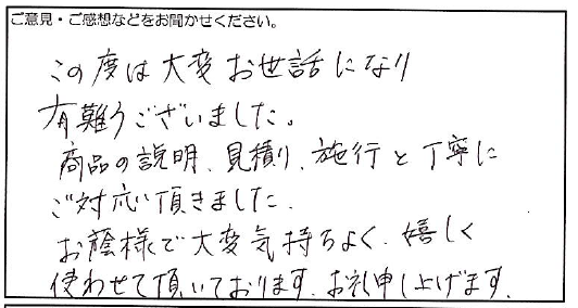 2024.06.08 お客様の声 西宮市 匿名様 この度は大変お世話になり 有難うございました。 商品の説明、見積り、施工と丁寧に ご対応頂きました。 お蔭様で大変気持ちよく、嬉しく 使わせて頂いております。お礼申し上げます。 お客様へ この度は弊社にご依頼いただき、誠にありがとうございます。 お客様からのご感想をいただけて、私たちもとても嬉しく思います。 今後もお客様に満足いただけるよう一層努力してまいります。