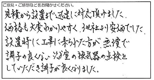 2024.06.08 お客様の声 西宮市 匿名様 見積から設置まで迅速に対応頂けました。 価格も大変わかりやすく、他社より安価でした。 設置時に工事に来られた方が、 無償で調子の良くない浴室の換気器の点検を していただき調子が良くなりました。 お客様へ この度は弊社にご依頼いただき、誠にありがとうございます。 お褒めいただき、大変光栄です。 今後も、よりよいサービスを お届けできるよう努めてまいります。