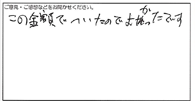2024.06.13 お客様の声 横浜市 匿名様 この金額でついたのでよかったです。 お客様へ この度は弊社にご依頼いただき、誠にありがとうございます。 ご満足いただけたようで、とても嬉しく思います。 これからもご満足いただけるサービスを ご提供できるよう努めてまいります。