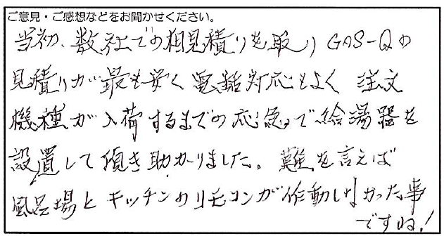 2024.06.13 お客様の声 吹田市 匿名様 当初、数社での相見積りを取り GAS-Qの見積りが最も安く電話対応もよく 注文機種が入荷するまでの応急で給湯器を設置して頂き助かりました。 難を言えば風呂場とキッチンのリモコンが作動しなかった事ですね! お客様へ この度は弊社にご依頼いただき、誠にありがとうございます。 お客様からのご感想をいただけて、 私たちもとても嬉しく思います。 リモコンは初期不良で動かずにご迷惑をおかけして申し訳ございません。