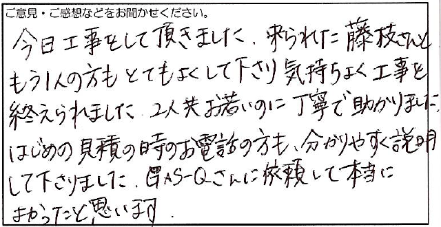 2024.06.13 お客様の声 西宮市 匿名様 今日工事をして頂きました。 来られた藤枝さんともう1人の方もとてもよくして下さり 気持ちよく工事を終えられました。 2人共お若いのに丁寧で助かりました。 はじめの見積の時のお電話の方も、 分かりやすく説明して下さりました。 GAS-Qさんに依頼して本当によかったと思います。 お客様へ この度は弊社にご依頼いただき、誠にありがとうございます。 励みになるお言葉をいただき、 大変うれしい限りです。 お客様からいただいたお言葉は、 全社員の励みになります。