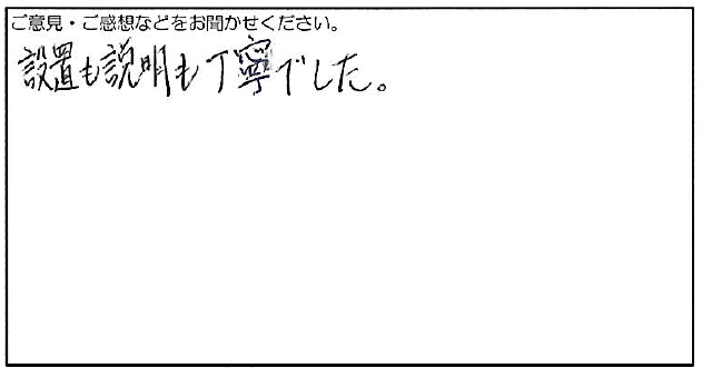 2024.06.13 お客様の声 神戸市 匿名様 設置も説明も丁寧でした。 お客様へ この度は弊社にご依頼いただき、誠にありがとうございます。 お客様からのご感想をいただけて、私たちも嬉しく思います。 今後もお客様に満足いただけるよう 一層努力してまいります。