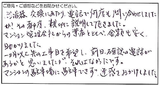 2024.06.13 お客様の声 尼崎市 匿名様 給湯器交換にあたり、電話で何度も問い合わせしましたが、 その都度、親切に説明して頂きました。 マンション管理会社からの業者と比べ、 金額も安く、助かりました。 一ヵ月以上先の工事日を希望し、前日、確認の電話が あるかと思いましたが、それはなかったです。 マンションの駐車場に駐車できず、迷惑をおかけしました。 お客様へ この度は弊社にご依頼いただき、誠にありがとうございます。 お客様からのご感想をいただけて、嬉しく思います。 前日の確認のお電話が無かったとのことでご不安な思いをおかけして申し訳ございません。 お客様のご意見を参考に、より良いサービスを提供できるよう努めてまいります。