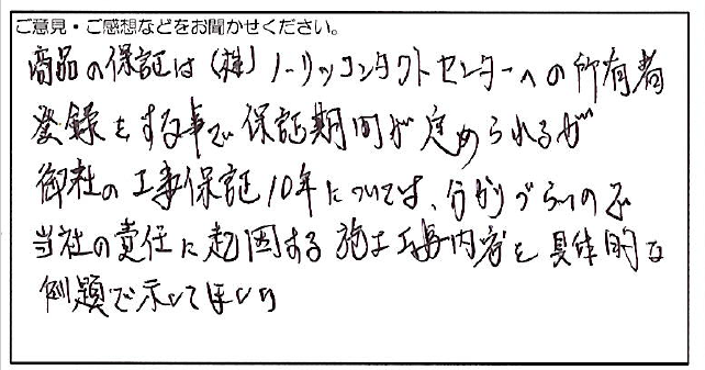 2024.06.13 お客様の声 枚方市 匿名様 商品の保証は(株)ノーリツコンタクトセンターへの所有者登録をする事で 保証期間が定められるが御社の工事保証10年については、分かりづらいので 当社の責任に起因する施工工事内容を具体的な例題で示してほしい。 お客様へ この度は弊社にご依頼いただき、誠にありがとうございます。 工事保証とは、弊社が施工した箇所で工事に起因する不具合が生じた場合、 弊社が一定期間(10年)は保証するというものです。 ご不明点やご質問がありましたら、 いつでもお気軽にお問い合わせくださいませ。