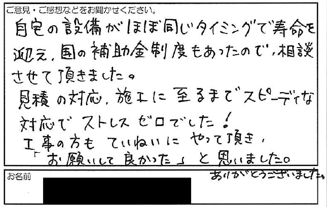 2024.09.16 お客様の声 神戸市 匿名様 自宅の設備がほぼ同じタイミングで寿命を迎え、 国の補助金制度もあったので、相談させて頂きました。 見積の対応、施工に至るまでスピーディな対応でストレスゼロでした! 工事の方もていねいにやって頂き、「お願いして良かった」と思いました。 ありがとうございました。 お客様へ この度は弊社にご依頼いただき、誠にありがとうございます。 お言葉をいただき、大変嬉しく思っております。 今後とも変わらぬご支援を賜りますようお願い申し上げます。