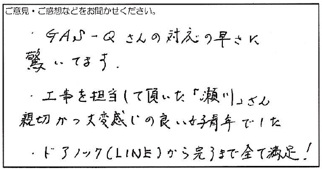 2024.09.16 お客様の声 八王子市 匿名様 ・GAS-Qさんの対応の早さに驚いています。 ・工事を担当して頂いた「瀬川」さん 親切かつ大変感じの良い好青年でした。 ・ドアノック(LINE)から完了まで全て満足! お客様へ この度は、温かいお言葉をいただき、誠にありがとうございます。 「瀬川」に対するお褒めの言葉も大変嬉しく、スタッフ一同励みになります。 今後とも、より一層のサービス向上を目指してまいりますので、引き続きよろしくお願い申し上げます。