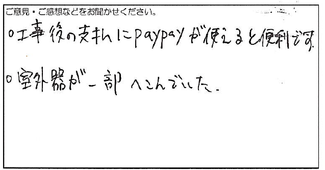 2024.09.16 お客様の声 西宮市 匿名様 ・工事後の支払にPayPayが使えると便利です。 ・室外器が一部へこんでいた。 お客様へ この度は、貴重なご意見をいただき誠にありがとうございます。 PayPayでのお支払いがご利用いただけず、ご不便をおかけしましたこと、 心よりお詫び申し上げます。今後のサービス向上に向けて、検討させていただきます。 また、室外機にへこみがあった件についても、ご不快な思いをさせてしまい、 大変申し訳ございません。早急に状況を確認し、必要な対応をさせていただきます。 今後もお客様にご満足いただけるサービスを提供できるよう、努力してまいりますので、 引き続きよろしくお願い申し上げます。