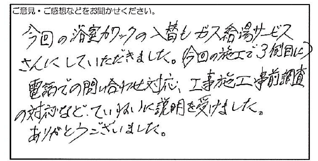 2024.09.16 お客様の声 吹田市 匿名様 今回の浴室カワックの入替もガス給湯サービスさんにしていただきました。(今回の施工で3回目に) 電話での問い合わせ対応、工事施工、事前調査の対応など ていねいに説明を受けました。 ありがとうございました。 お客様へ いつもご利用いただき、誠にありがとうございます。 今回で3回目のご依頼とのこと、大変嬉しく思います。 電話での対応や工事施工、事前調査においてもご満足いただけたことを、 スタッフ一同大変励みに感じております。 今後も変わらぬサービスを提供できるよう努めてまいりますので、 引き続きよろしくお願い申し上げます。