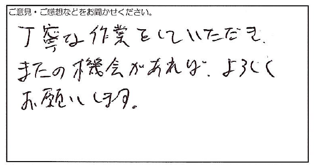 2024.09.16 お客様の声 川崎市 匿名様 丁寧な作業をしていただき、 またの機会があればよろしくお願いします。 お客様へ この度は、作業についてのお言葉をいただき、大変嬉しく思います。 今後また機会がございましたら、ぜひともよろしくお願い申し上げます。 引き続き、サービス向上に努めてまいりますので、どうぞよろしくお願いいたします。