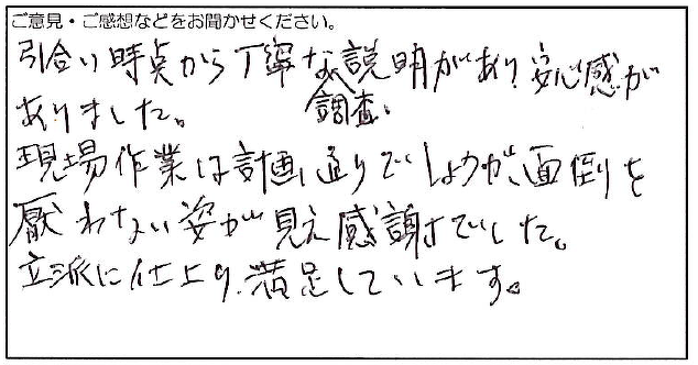 2024.09.16 お客様の声 神戸市 匿名様 引合い時点から丁寧な調査説明があり、安心感がありました。 現場作業は計画通りでしょうが、面倒を厭わない姿が見え感謝でした。 立派に仕上がり、満足しています。 お客様へ この度は、温かいお言葉をいただき誠にありがとうございます。 仕上がりにご満足いただけて何よりです。 今後とも、さらに良いサービスを提供できるよう努めてまいりますので、 引き続きよろしくお願い申し上げます。