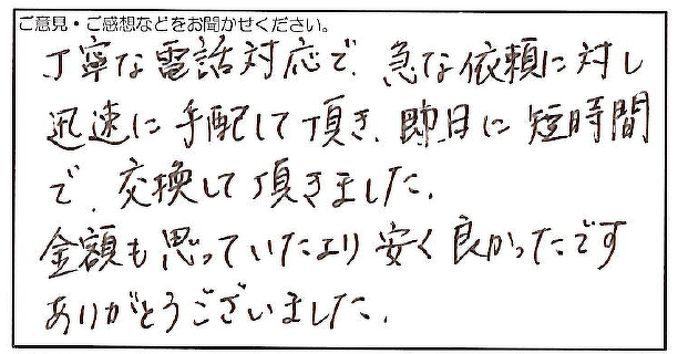 2025.01.10 お客様の声 明石市 匿名様 丁寧な電話対応で、急な依頼に対し迅速に手配して頂き、即日に短時間で、交換して頂きました。 金額も思っていたより安く良かったです。 ありがとうございました。 お客様へ この度は弊社にご依頼いただき、誠にありがとうございます。 お言葉をいただき、心より感謝申し上げます。 今後とも、より一層のサービス向上に努めてまいりますので、 引き続きよろしくお願い申し上げます。