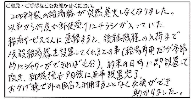 外のお風呂を利用することなく新しい給湯器の設置が無事に完了できたとのことで、安心いたしました。
