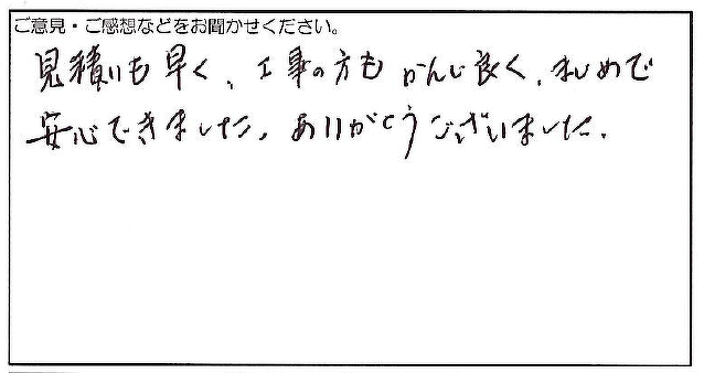 2025.01.10 お客様の声 神戸市 匿名様 見積りも早く、工事の方もかんじ良く、まじめで 安心できました。ありがとうございました。 お客様へ この度は、嬉しいお言葉をいただき、誠にありがとうございます。 見積りや工事の対応についてご満足いただけたこと、大変嬉しく思います。 今後もお客様に安心してご利用いただけるよう、丁寧な対応を心がけてまいりますので、 引き続きどうぞよろしくお願い申し上げます。