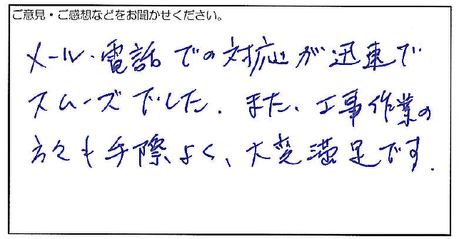 2025.01.10 お客様の声 明石市 匿名様 メール・電話での対応が迅速で スムーズでした。また、工事作業の 方々も手際よく、大変満足です。 お客様へ この度は、嬉しいお言葉を頂き、誠にありがとうございます。 対応、工事作業にご満足いただけたとのことで、大変嬉しく思います。 今後とも、お客様にご満足いただけるよう一層の努力をしてまいりますので、 何かご不明点やご要望がございましたら、どうぞお気軽にお申し付けください。 引き続き、よろしくお願い申し上げます。