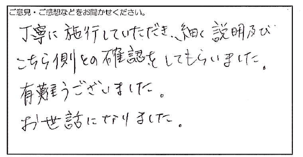 2025.01.10 お客様の声 尼崎市 匿名様 丁寧に施行していただき、細く説明及び こちら側との確認をしてもらいました。 有難うございました。 お世話になりました。 お客様へ この度は、嬉しいお言葉をいただき、誠にありがとうございます。 施工に関して対応を評価していただけたこと、大変光栄に思います。 今後もお客様にご満足いただけるよう、細やかな配慮を忘れずに対応してまいりますので、 引き続きよろしくお願い申し上げます。